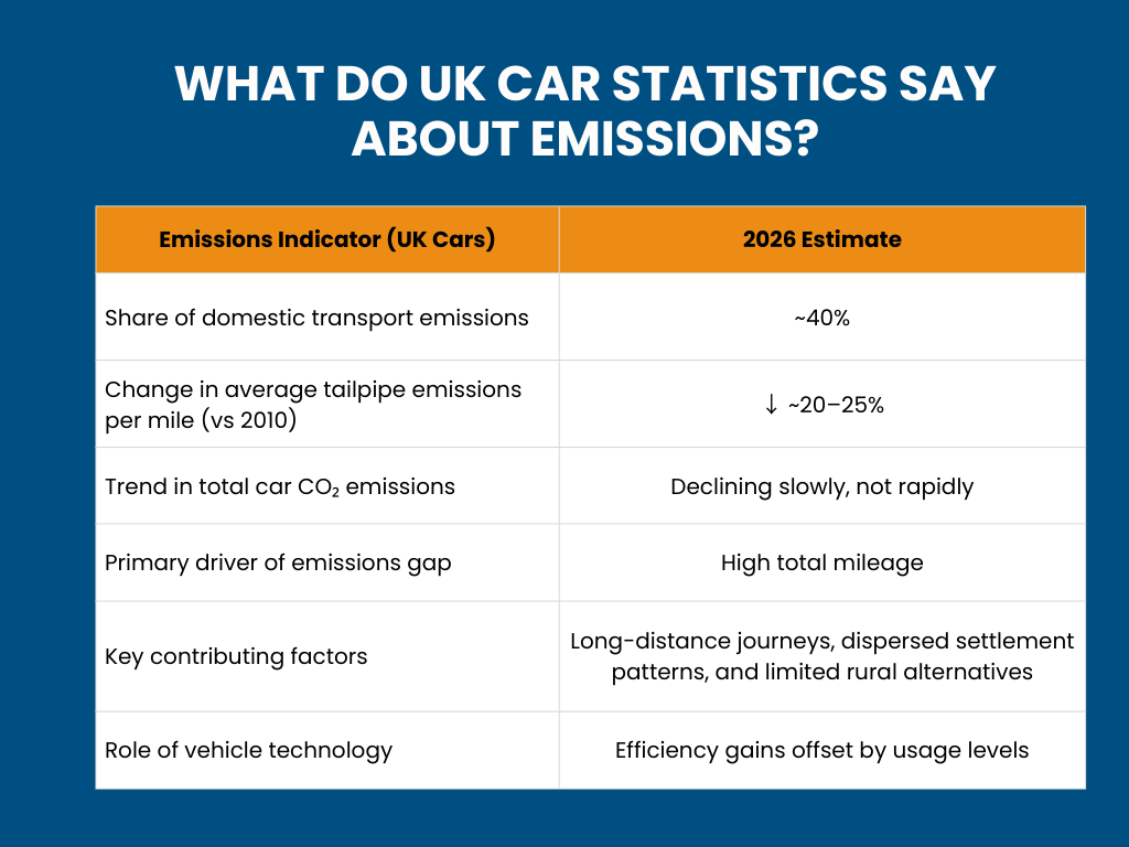 Cars remain one of the largest sources of transport emissions in the UK, even as overall emissions per mile continue to fall. Efficiency improvements, cleaner engines, and electrification have reduced average emissions, but high mileage levels offset many of these gains.